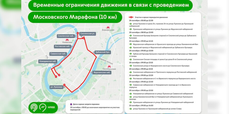 В субботу, 20 сентября, с 05:00 до 12:30 будет закрыт участок улицы Лужники от дома 24, строения 24, до Лужнецкой набережной. В воскресенье, 21 сентября, аналогичные ограничения будут действовать с 03:00 до 12:30. Также с 05:00 до 12:30 20 сентября и с 03:00 до 11:30 21 сентября будет недоступна Лужнецкая набережная от улицы Лужники до Фрунзенской набережной.